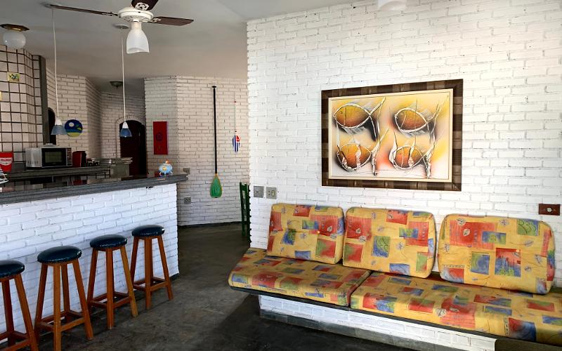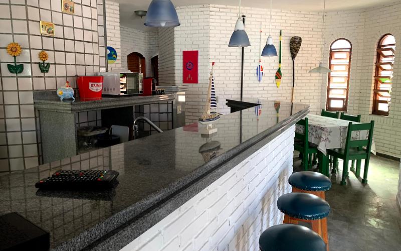 Sala de Estar equipada com ventilador de teto, sofá, banquetas tipo americana, TV de Lcd e quadros decorativos. Sala de Jantar equipada com mesa retangular com 5 cadeiras e quadros decorativos. Cozinha americana completa equipada com cooktop 6 bocas, geladeira, forno microondas, pia em granito, liquidificador, talheres, pratos, panelas, copos, etc... Banheiro social. Varanda coberta, churrasqueira e Ducha de praia.