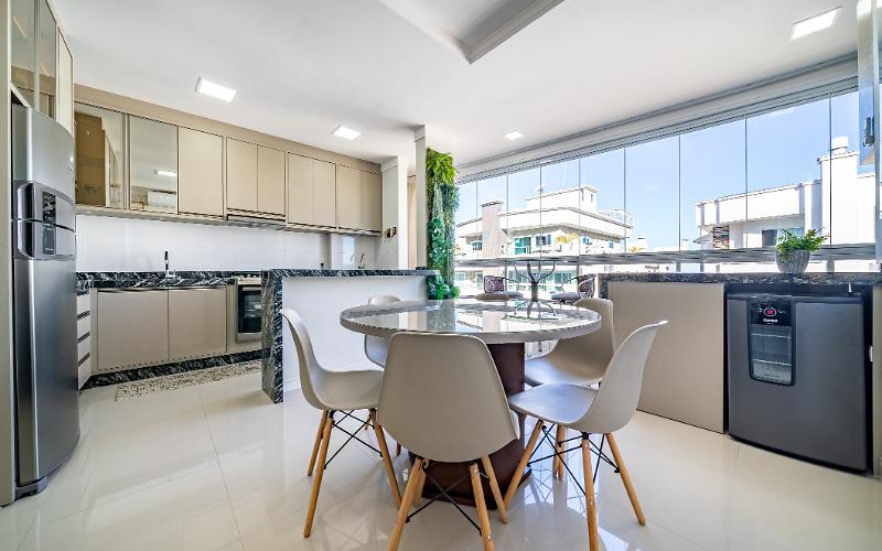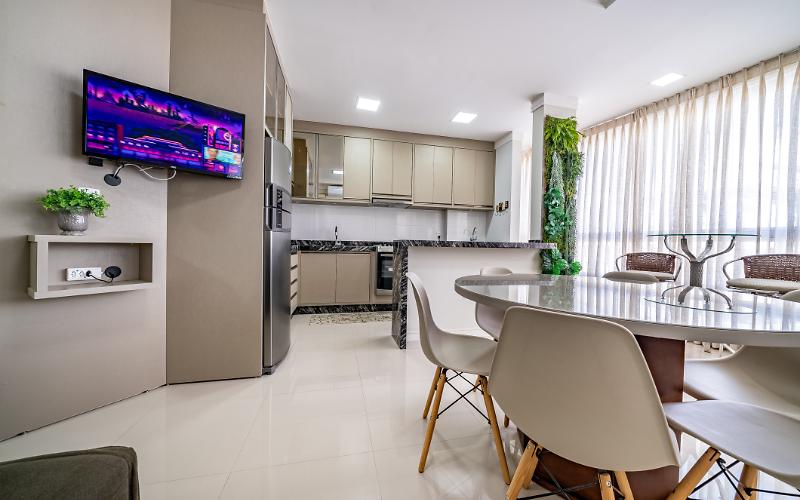 Cozinha equipada com geladeira, fogão com forno, microondas e adega. Lavanderia com máquina lava e seca.